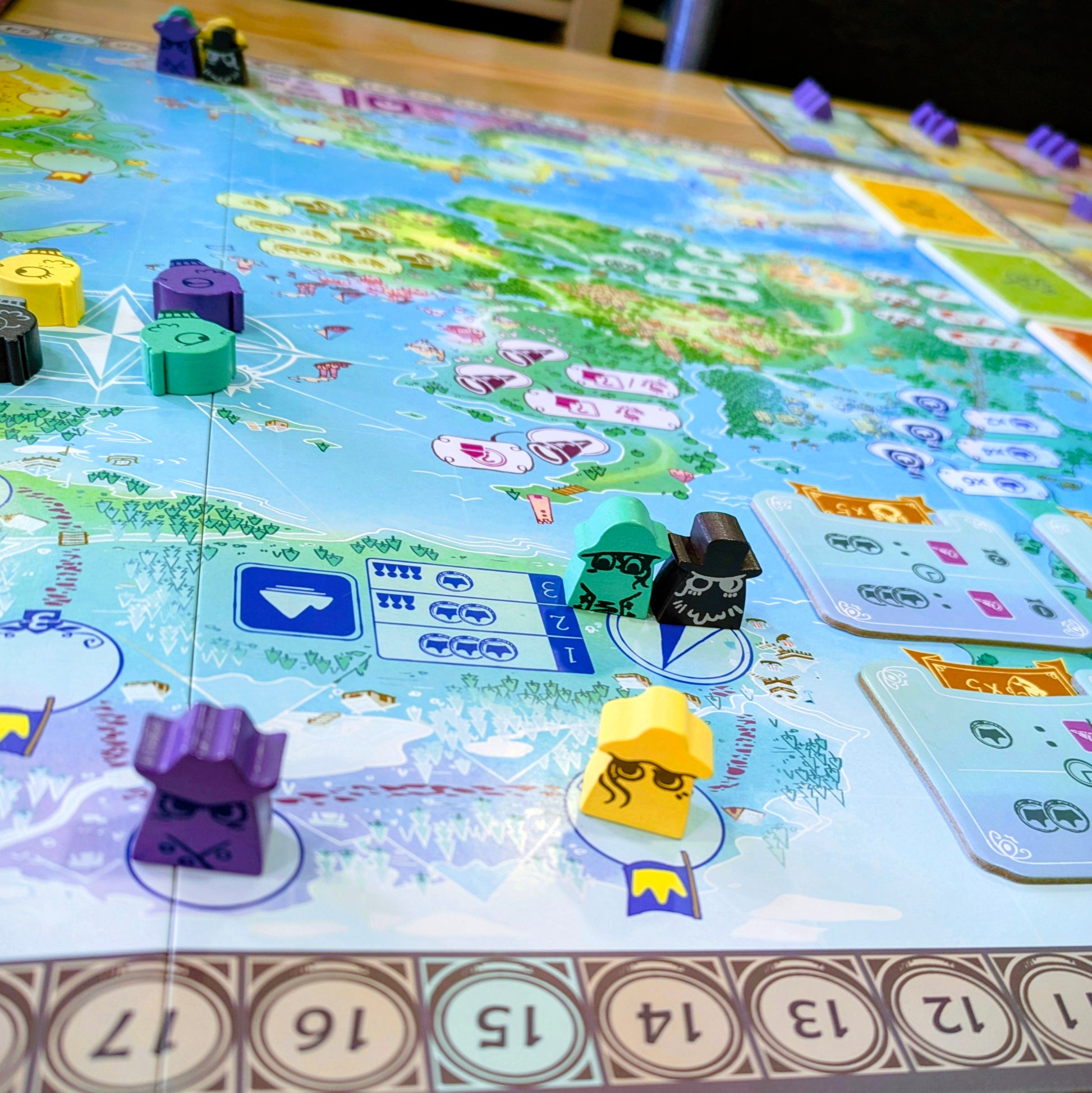 Explorers of Navoria is een avontuurlijk en strategisch bordspel voor 2-4 spelers waarin je in het magische land Navoria op ontdekkingstocht gaat naar nieuwe continenten die uit de zee zijn opgerezen. Spelers trekken actietokens uit een zak om Adventure-kaarten te draften die helpen bij het verkennen van onbekende gebieden, het bouwen van nederzettingen, het vervaardigen van voorraden en het samenwerken met verschillende volkeren. Sommige kaarten bieden directe voordelen, andere geven doorlopende vaardigheden die je tableau versterken en je reputatie verhogen om eindspelbonussen te ontgrendelen. Na het draften gebruik je de dezelfde tokens tijdens een worker-placement fase om locaties te bezoeken, voordelen te verkrijgen en je strategie verder uit te bouwen, waarbij de volgorde van acties en geplaatste tokens de kracht van locaties bepaalt en tactische keuzes essentieel zijn.